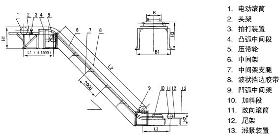 M3/h35° 28 36 50 71 104 120 157 195 216 327 331 466 500 794 45° 19 25 33 57 83 97 127 157 175 271 267 384 414 680 60° 15 19 23 40 58 59 90 112 124 197 190 278 302 524 90 9 11 15 21 31 37 48 60 66 106 102 149 162 281 外型尺寸 頭輪帶面高H1 1200 1350 1615 1815 2000,2200 2300,2525 2525,2700 尾輪帶面高H2 690 800 950 1115 1250,1400 1600,1700 1600,1700 中間段帶面高H3 700 800 850 1115 850,1200 1400,1500 1600,1700 中間段地腳高B1 580 850 1020 1220 1440 1690 1890 注:本表中輸送量按最小橫隔板間距計(jì)算,帶速增減,輸送量成倍增減,其他物料可參見此表確定。