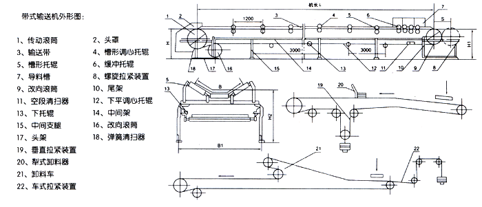 電氣保護(hù)可設(shè)有:輸送帶跑偏監(jiān)測器;輸送帶打滑監(jiān)測器;輸送帶縱向撕裂信號監(jiān)測器;料位控制監(jiān)測器等。帶式輸送機(jī)外形圖